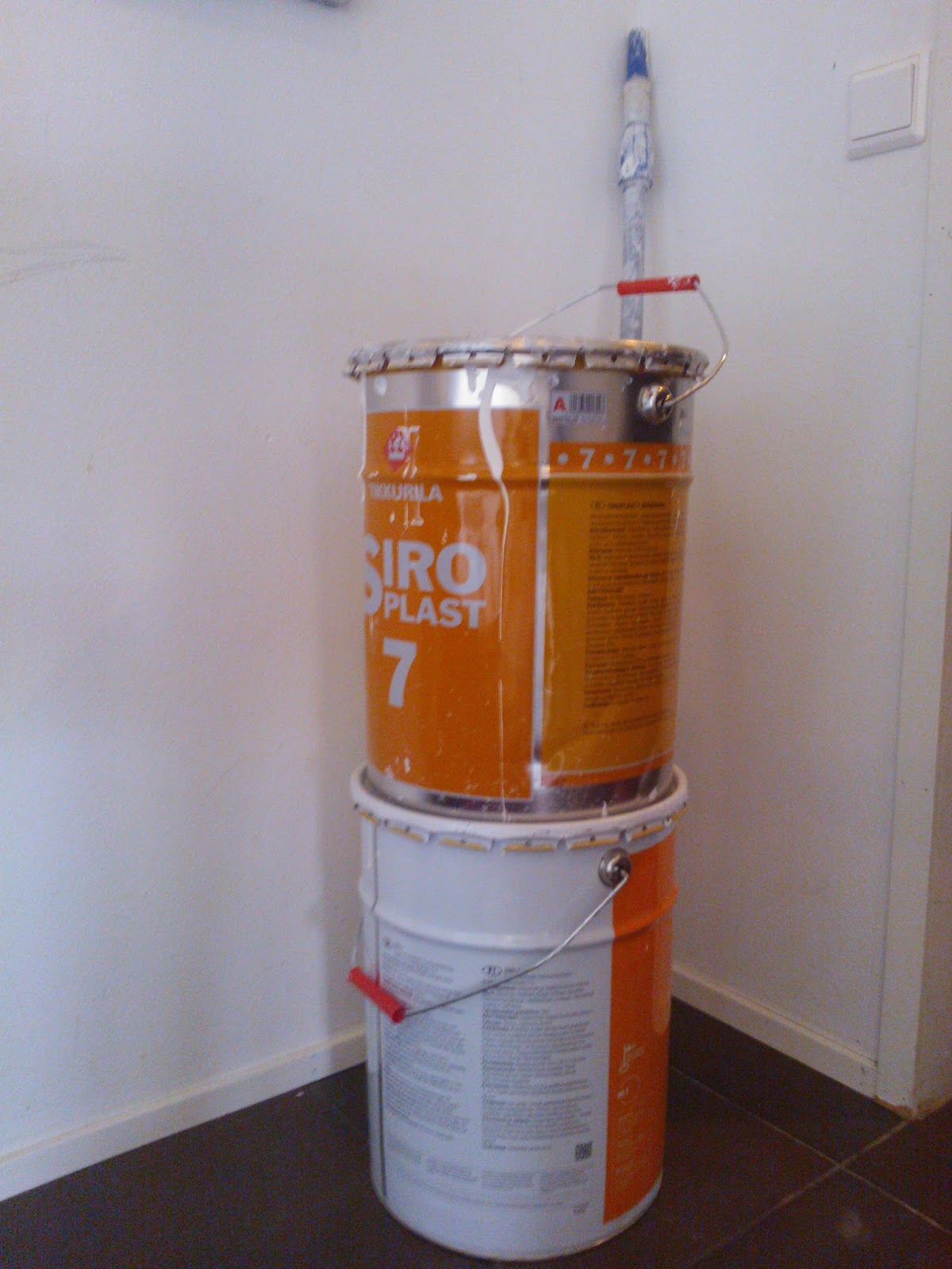 Tein tässä tällä viikolla kevätsiivousta vähän omalla tavallani, ens viikolla vielä vähän jatkan. Suosittelen muillekin tätä loistavaa siivousvinkkiä. Tässä on meidän kevätsiivousvälineet, telat ja pensselit on toisen purkin sisällä.