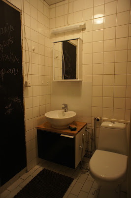 Kylppäri kuuluu meidän isompaan asuntoon, mutta se otettiin pienemmän asunnon käyttöön silloin 2015, ennen Espanjan reissua, kun muutettiin pienelle puolelle, eikä sinne ehditty kylppäriä tekemään. Silloin tehtiin siihen vain pikainen kohennus. Kylppäri on sairaan pieni ja sen verran tehtiin sinne muutosta, että otettiin suihkuseinä pois ja laitettiin sinne suihkukaappi, mikä juuri ja juuri sinne mahtui (vaati pienen reiän kattoonkin), koska vesieristeistä ei ollut tietoa. Suihkukaappi oli siihen tilaan turvallisin vaihtoehto. Lattian maalasin laattamaalilla ja vanhan oviaukon päälle, mikä oli silloin kipsilevypinnalla, laitoin liitutauluteipin. Pari laattaa liitutaulun helmaan, listat ympärille ja se oli silloin siinä. Allaskalusto oli laitettu jo aiemmin. En nyt sitten kuitenkaan löytänyt kuvia ekasta hätäremontista, vaikka jossain ne kuvat pitäisi olla. Tässä nyt lähes alkuperäinen kuva, allaskaappi vain vaihdettu.